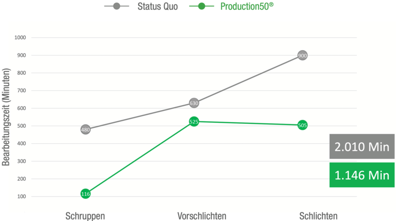 MOLDINO geht bei Optimierungsprojekten stets nach der vom japanischen Werkzeughersteller speziell für den Fräsbereich entwickelten Production50-Methode vor. Dabei geht es darum, die bestehenden Fräsprozesse zu analysieren, um mit diesen Informationen eine neue Perspektive auf den gesamten Fertigungsprozess zu erhalten.