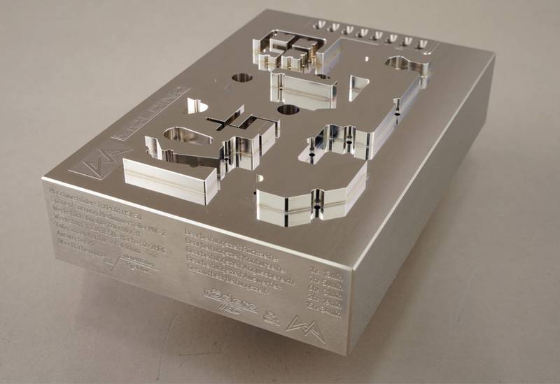 Zasnova je predstavljala več izzivov: na primer, za ejektorje je bilo treba strojno obdelati 37 skoznjih lukenj s toleranco H7 in premerov 0,6 mm, 0,8 mm, 1 mm, 1,5 mm in 2 mm. Trije dodatni prilegi s premerom 6 mm so imeli zahteve glede tolerance od 0 do +3 µm. Tudi stranska tesnilna območja vložka kalupa so bila zahtevna, predvsem zaradi visokih zahtev glede cilindričnosti. To je veljalo tudi za tri optične površine (zrcalne površine), ki jih je bilo treba izdelati z zahtevano vrednostjo središčne hrapavosti Ra 0,025 µm. Zato je bil za vzorčni obdelovanec izbran material, pretaljen z elektrožlindro (ESR), saj je zelo primeren za izdelavo površin z visokim sijajem. Sicer je bila toleranca konturnih in osnovnih površin +/- 0,01 mm, kar je značilno za vložke za brizgalne kalupe.